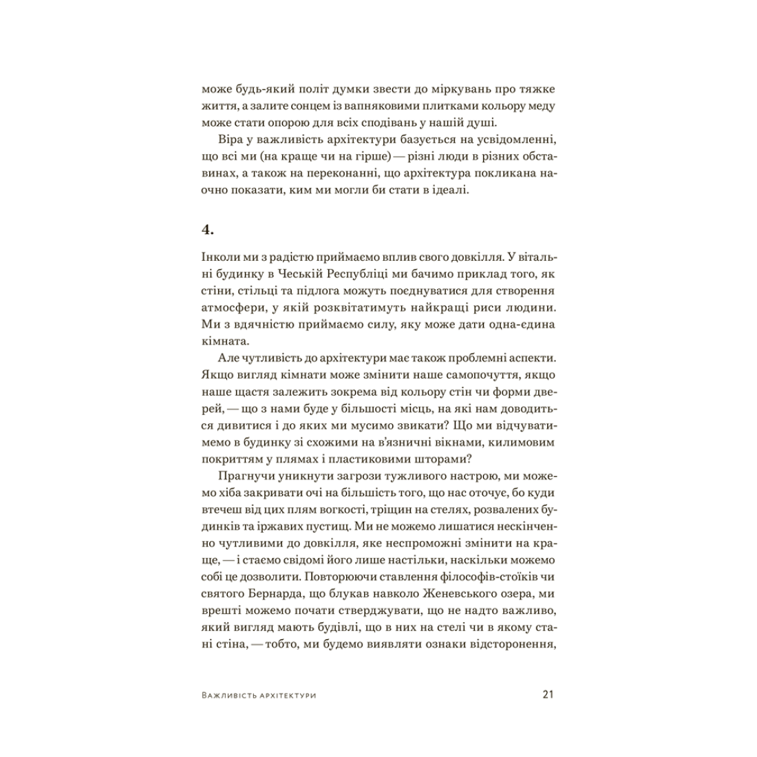 Ален де Боттон пише про архітектуру як про живе середовище, що не тільки визначає поточний настрій мешканця чи гостя, не тільки віддзеркалює й викриває його риси, прагнення, звички, а й певною мірою визначає майбутнє. Адже те, як ми почуваємося у своїй спальні чи бібліотеці, впливає на наше ставлення до ширшого світу, бачення власного майбутнього й готовість боротися за нього.