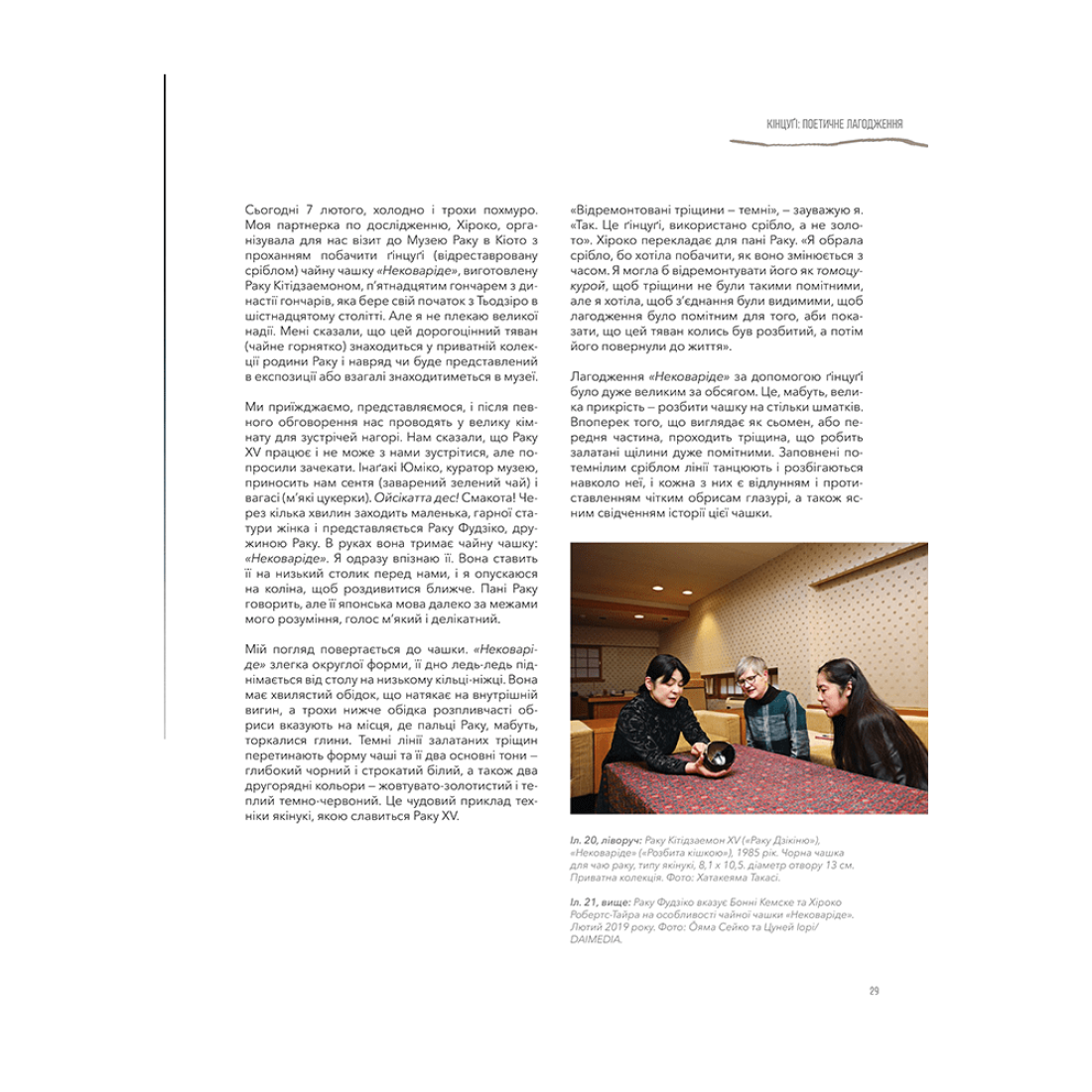 Щиро вам дякую, що допомагаєте зрозуміти це мистецтво в нашій країні. Бо, нажаль, забобони щодо битого досі існують. Але ж є Кінцугі. Це більше, ніж техніка реставрації. Це є філософія сприйняття, і не тільки пошкодженого посуду. Вдячна вам, що відгукнулися на моє звернення щодо видання цієї книги. Це була мрія, яку ви втілили. Дуже важко було пояснювати, що означає моя діяльність, чим я займаюся, яка мета та користь. В Україні досі ще багато людей вперше чують це слово. Тепер їх буде менше, завдяки вам. Вдячна!