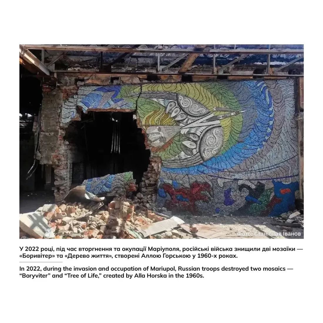 Втім, залишаються незмінними кремлівські методи культурного геноциду українського народу через фізичне нищення творів українського мистецтва та їхніх творців. У 2022 році, під час вторгнення та окупації Маріуполя, російські війська знищили дві мозаїки — «Боривітер» та «Дерево життя», створені Аллою Горською у 1960-х роках.