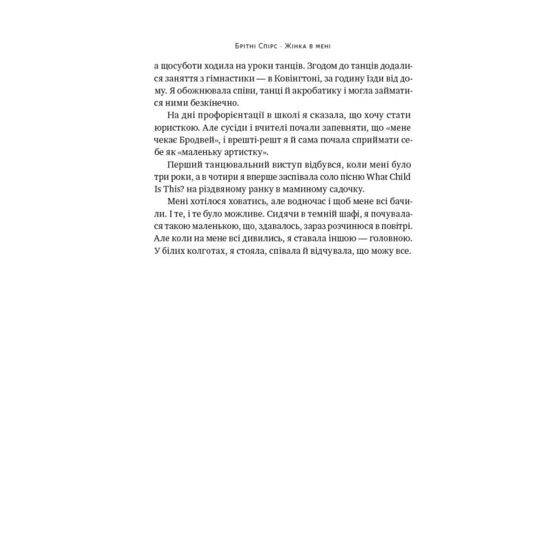 У цій книжці Брітні Спірс відверто ділиться власною історією від раннього дитинства до сьогодні — до відродження жінки в собі. Що пов’язувало її з Аґілерою і Ґослінґом, Майклом Джексоном і Мадонною, як вона стала обличчям Pepsi та «Жінкою року» за версією Billboard, як сім’я перетворила її на машину із заробляння грошей, через який біль довелося пройти після розриву з Тімберлейком, чого коштувало місяцями не бачити синів — Брітні торкається навіть найтемніших сторінок своєї історії, 13 років під у̶в̶’̶я̶з̶н̶е̶н̶н̶я̶м̶ опікою батька.